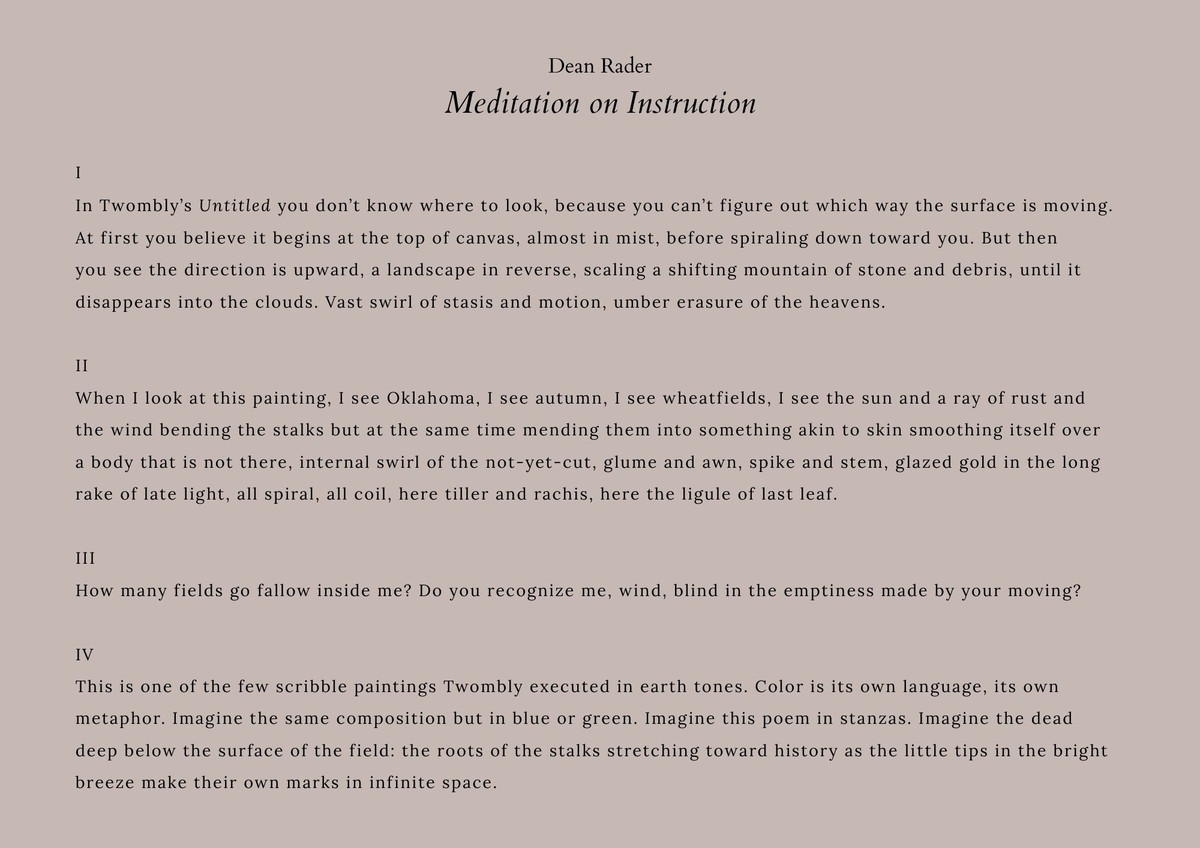 This Interlude features Dean Rader's poem "Meditation on Instruction", inspired by Cy Twombly's painting Untitled, 1970, in conversation with Alva Noto's Xerrox Topia from the album Xerrox Vol.5 (Noton, 2024).